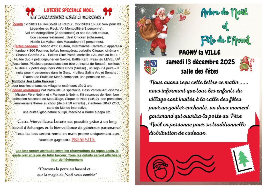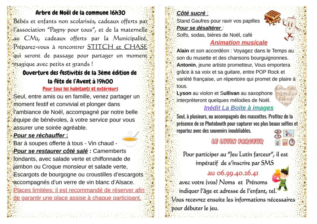L’arbre de Noël de la commune aura lieu le 13 décembre suivie de la fête de l’Avent. Il avait été annoncé pour une parution cette semaine, pour ne rien manquer, découvrez ci-dessous le programme complet des festivités sur notre commune, en cette fin d’année Le programme est détaillé et contient toutes les informations nécessaires Jeu du Lutin Farceur dès 3 ans UNIQUEMENT sur inscription au 0699402641 pour valider la participation et qui vous permettra de recevoir le détail complet du jeu. Chaque enfant qui trouvera la bonne réponse finale participera automatiquement à une superbe tombola “enfant” Comme pour la loterie adulte, seul les enfants gagnants présents se verront attribuer leur lot