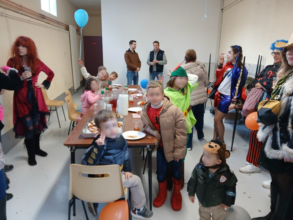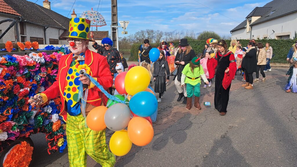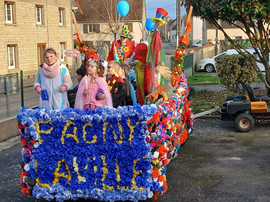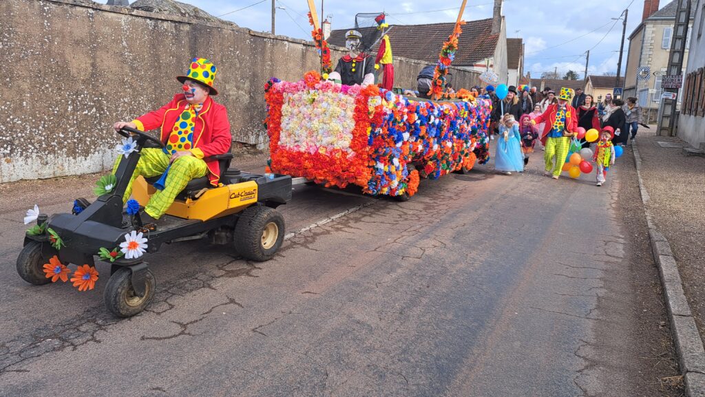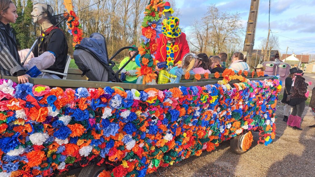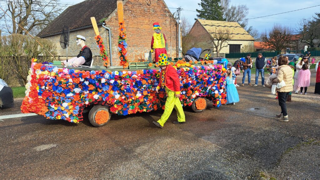 Après une semaine toute grisonnante et pluvieuse, le samedi 28 février à 15h30, un grand soleil pour cet après-midi apparaissait à Pagny la ville. Des habitants déguisés ou non, du village et des alentours sont venus pour participer au défilé organisé dans les rues du village, avec un superbe char fleuri par une quinzaine de bénévoles. Nous remercions toutes celles et ceux qui ont fabriqué ce très grand nombre de fleurs., et confectionné ce superbe char, ayant pour thème la pêche. A l’arrière le nom de notre commune, les côtés du char et les roues colorées ont donné à nos rues une vitalité multicolore et joyeuse. 4 kms ont été parcouru par petits et grands avec de la musique et la trompette du chauffeur. Quelques familles sont sorties dans leur cour pour voir passer ce joyeux défilé. A la fin de ce parcours, un bon goûter attendait ce public jeune et moins jeunes, à la petite salle des fêtes.